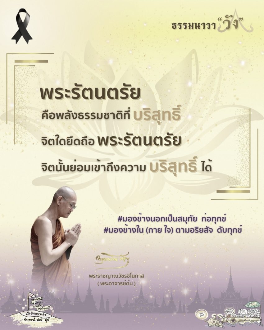 หลากหลายคำถามเชิญแสดงความคิดเห็น– เมื่อจิตใจ “ยึดถือพระรัตนตรัย” เป็นที่พึ่งอย่างแท้จริงในชีวิตประจำวันของคุณ — ช่วงใดคือช่วงเวลาที่รู้สึกว่า “ใจบริสุทธิ์” ที่สุด?– พระรัตนตรัยมีความหมายอย่างไรต่อคุณ แล้วทำไมคุณต้องระลึกพระรัตนตรัย?– เรามักจะได้ยินคำกล่าวที่ว่า“ตนเป็นที่พึ่งเเห่งตน”ซึ่งคุณทราบหรือไม่ว่าพระรัตนตรัยคือสิ่งที่จะทำให้คุณสามารถพึ่งตนเองได้อย่างไร?– เราเกิดมาด้วยความไม่รู้ เมื่อไม่รู้ย่อมมีความกลัว เมื่อมีความกลัว จิตใจจะหาสิ่งใดสิ่งหนึ่งเป็นที่พึ่ง แม้ถ้าท้ายที่สุดแล้วเราทราบด้วยเหตุผลว่าเราก็ต้องพึ่งตัวเราเอง แล้วเราควรจะยึดพึ่งสิ่งใดที่จะทำให้เรามั่นใจได้ว่า เราเป็นที่พึ่งให้กับตัวเราเองได้? พระรัตนตรัยคือพลังธรรมชาติที่บริสุทธิ์จิตใดยึดถือพระรัตนตรัยจิตนั้นย่อมเข้าถึงความบริสุทธิ์ได้ พระราชญาณวัชรชิโนภาส(จารุวณฺโณ ภิกฺขุ)พระอาจารย์ต้น