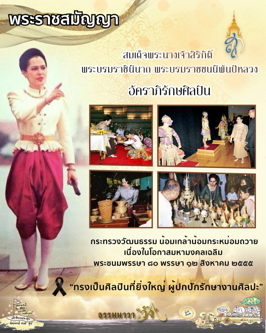 สมเด็จพระนางเจ้าสิริกิติ์ พระบรมราชินีนาถ พระบรมราชชนนีพันปีหลวง ทรงพระปรีชาสามารถล้ำเลิศในงานประณีตศิลป์ทุกแขนง ทรงตระหนักในคุณค่าแห่งความงามของศิลปะ และทรงทุ่มเทพระกำลังในการทำนุบำรุงงานศิลปะไว้เป็นสมบัติศิลป์แห่งแผ่นดินไทย พระองค์ทรงเป็นมิ่งขวัญของเหล่าช่างศิลปิน ทรงมีคุณูปการอย่างยิ่งในการอุปถัมภ์ช่างศิลปะ ทรงอนุรักษ์และฟื้นฟูงานศิลปะที่ใกล้จะสูญสิ้นให้กลับคืนมาสร้างคุณค่าและความภาคภูมิใจแก่ประชาชนชาวไทย พระมหากรุณาธิคุณในการทำนุบำรุงงานศิลปะมีอเนกประการ พระราชอัธยาศัยและพระราชนิยมในความเป็นไทย ทำให้พระองค์มีพระราชปณิธานและพระราชประสงค์จะเผยแพร่เอกลักษณ์แห่งความเป็นไทยให้เป็นที่รู้จักของชนทั่วโลก พระองค์ตั้งพระราชหฤทัยที่จะช่วยให้ชาวไทยมีงานศิลปหัตถกรรมเป็นอาชีพเสริมนอกเหนือจากเกษตรกรรมซึ่งเป็นอาชีพหลักเพื่อสร้างรายได้และแก้ไขปัญหาความยากจน ซึ่งนอกจากจะช่วยรักษาศิลปหัตถกรรมโบราณของไทยหลายชนิดมิให้เสื่อมสูญไปแล้ว ยังทำให้ราษฎรมีความภูมิใจในคุณค่าแห่งความสามารถของตน และนานาอารยประเทศได้ตระหนักในฝีมือและความเจริญทางศิลปวัฒนธรรมของไทย กระทรวงวัฒนธรรมในนามคณะกรรมการวัฒนธรรมแห่งชาติ จึงมีมติถวายพระราชสมัญญา “อัคราภิรักษศิลปิน” มีความหมายว่า “ศิลปินยิ่งใหญ่ผู้ปกปักรักษางานศิลปะ” แด่สมเด็จพระนางเจ้าสิริกิติ์ พระบรมราชินีนาถ พระบรมราชชนนีพันปีหลวง เพื่อเฉลิมพระเกียรติเนื่องในโอกาสมหามงคลเฉลิมพระชนมพรรษา ๘๐ พรรษา ๑๒ สิงหาคม ๒๕๕๕ และสำนึกในพระมหากรุณาธิคุณที่สมเด็จพระนางเจ้าสิริกิติ์ พระบรมราชินีนาถ พระบรมราชชนนีพันปีหลวง ทรงปฏิบัติพระราชกรณียกิจนานัปการในการอนุรักษ์ ฟื้นฟู รักษา สร้างสรรค์ ส่งเสริม สืบทอด และพัฒนามรดกทางศิลปะของแผ่นดินให้เจริญรุ่งเรืองอย่างต่อเนื่อง เป็นที่ประจักษ์แก่สาธารณชนทั้งในประเทศและต่างประเทศ อันเป็นประโยชน์ยิ่งต่อพสกนิกรชาวไทยและชาติบ้านเมือง ที่มา : หนังสือ“สมเด็จพระนางเจ้าสิริกิติ์ พระบรมราชินีนาถพระบรมราชชนนีพันปีหลวง”เฉลิมพระเกียรติเนื่องในโอกาสทรงเจริญพระชนมพรรษา ๘๘ พรรษา๑๒ สิงหาคม ๒๕๖๓(หน้า ๔๗)โดย กระทรวงวัฒนธรรมจัดพิมพ์ดาวน์โหลด ==>https://dhammanava.net/wp-content/uploads/2025/11/88Years.pdf