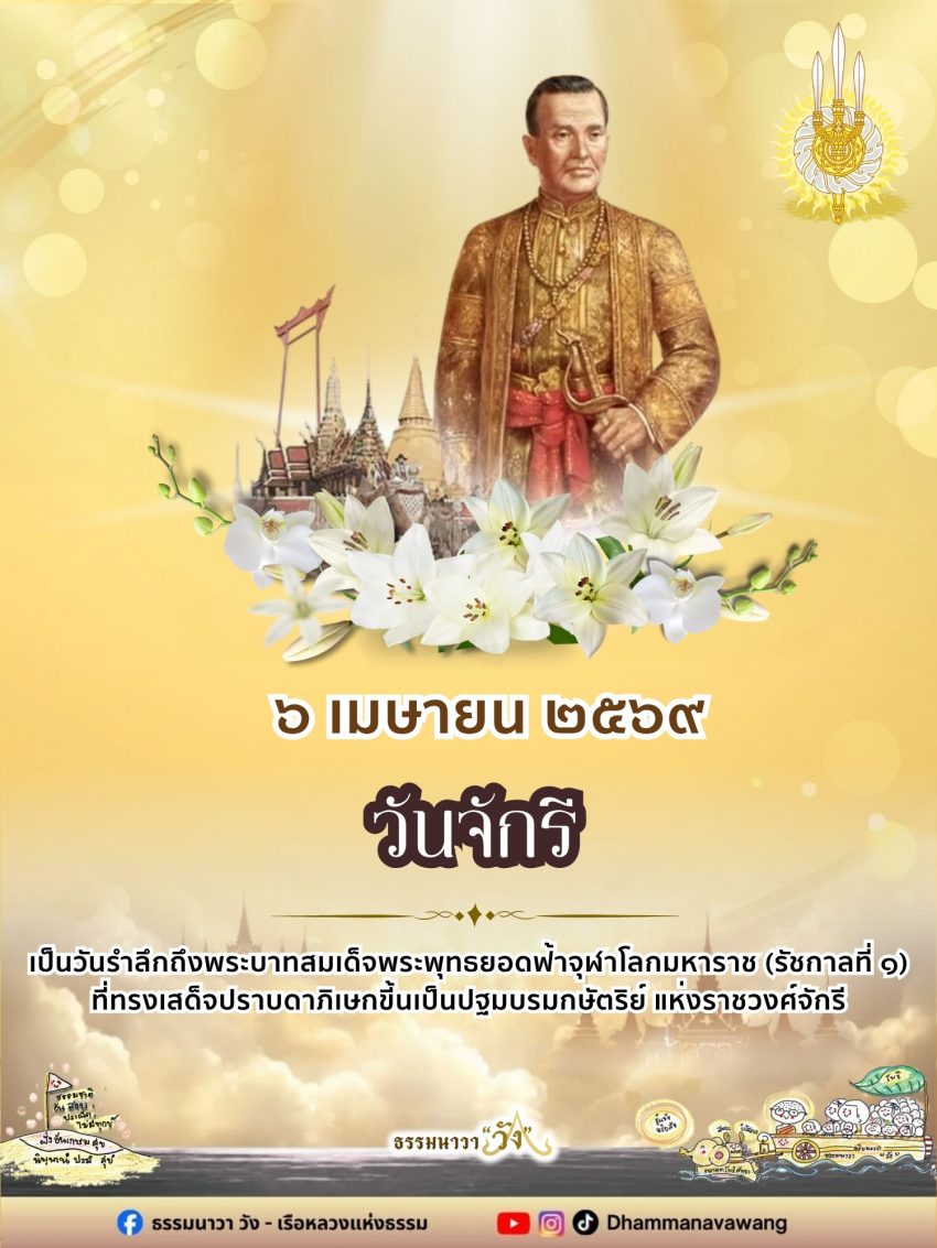 น้อมสำนึกในพระมหากรุณาธิคุณอย่างหาที่สุดมิได้ วันที่ ๖ เมษายน ของทุกปีเป็น วันจักรีวันสำคัญที่ปวงชนชาวไทยร่วมรำลึกถึงพระบาทสมเด็จพระพุทธยอดฟ้าจุฬาโลกมหาราชปฐมบรมกษัตริย์แห่งพระบรมราชจักรีวงศ์ผู้ทรงสถาปนากรุงรัตนโกสินทร์และทรงวางรากฐานอันมั่นคงแก่บ้านเมืองสืบมาจนถึงปัจจุบัน ในโอกาสอันสำคัญนี้ขอน้อมรำลึกในพระมหากรุณาธิคุณแห่งบูรพมหากษัตริยาธิราชเจ้าแห่งพระบรมราชจักรีวงศ์ทุกพระองค์ผู้ทรงประกอบพระราชกรณียกิจนานัปการเพื่อความผาสุกของอาณาประชาราษฎร์และความมั่นคงของแผ่นดินไทย ขอเชิญพสกนิกรชาวไทยทุกท่านร่วมตั้งจิตน้อมรำลึกในพระมหากรุณาธิคุณและร่วมกันประพฤติปฏิบัติในสิ่งที่ดีงามเพื่อสืบสานคุณค่าของความจงรักภักดีคุณธรรม และความกตัญญูต่อแผ่นดินไทย