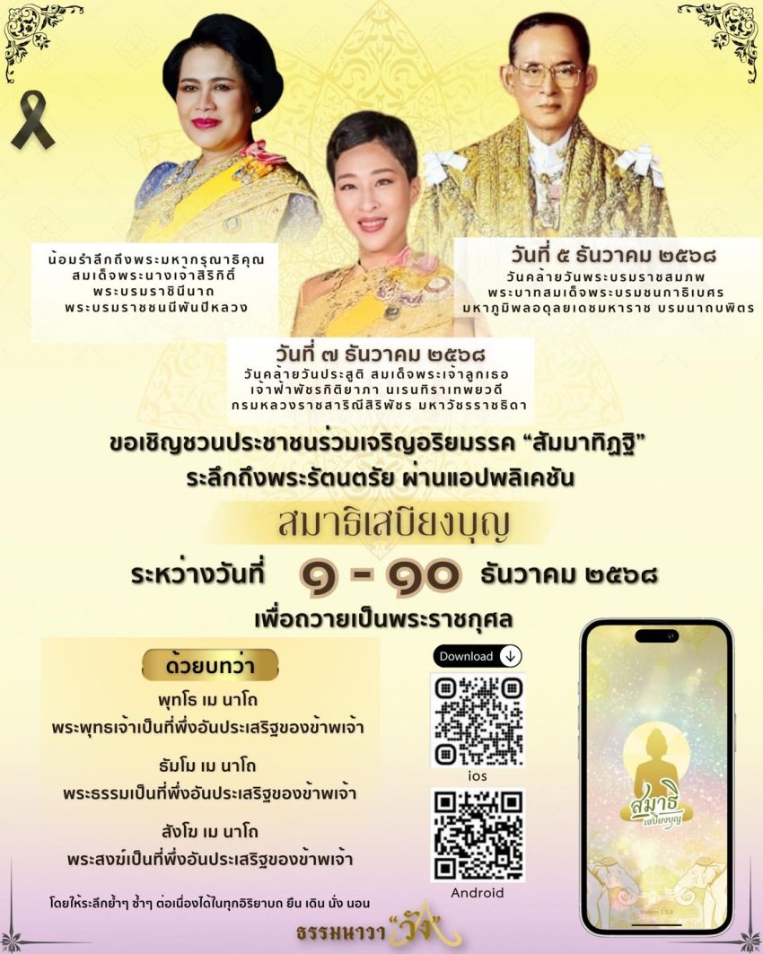 สำนักพระราชวัง ขอเชิญชวนพสกนิกรทุกหมู่เหล่าร่วมกัน “เจริญอริยมรรคหมวดสัมมาทิฏฐิ”ระลึกถึงพระรัตนตรัยเป็นสรณะที่พึ่งอันสูงสุดตั้งมั่นในธรรมอันประเสริฐที่พระสัมมาสัมพุทธเจ้าทรงตรัสรู้และทรงสั่งสอนไว้อย่างถูกต้องชอบธรรม เพื่อถวายเป็นพระราชกุศล เนื่องในวันคล้ายวันพระบรมราชสมภพพระบาทสมเด็จพระบรมชนกาธิเบศร มหาภูมิพลอดุลยเดชมหาราช บรมนาถบพิตรวันที่ ๕ ธันวาคม ๒๕๖๘ พร้อมทั้งน้อมรำลึกในพระมหากรุณาธิคุณสมเด็จพระนางเจ้าสิริกิติ์ พระบรมราชินีนาถ พระบรมราชชนนีพันปีหลวงและร่วมแสดงความจงรักภักดีเนื่องในโอกาสวันคล้ายวันประสูติสมเด็จพระเจ้าลูกเธอ เจ้าฟ้าพัชรกิติยาภา นเรนทิราเทพยวดีกรมหลวงราชสาริณีสิริพัชร มหาวัชรราชธิดาวันที่ ๗ ธันวาคม ๒๕๖๘ ขอเชิญทุกท่านร่วมบันทึกเวลาเจริญสมาธิจิตตภาวนาผ่านแอปพลิเคชัน “สมาธิเสบียงบุญ”ระหว่างวันที่ ๑–๑๐ ธันวาคม ๒๕๖๘เพื่อรวมจิตใจแห่งความดี และน้อมถวายเป็นพุทธบูชา ธรรมบูชา สังฆบูชาและถวายเป็นราชสักการะแด่ทั้งสามพระองค์ ดาวน์โหลดได้ทั้ง Play Store และ App Store