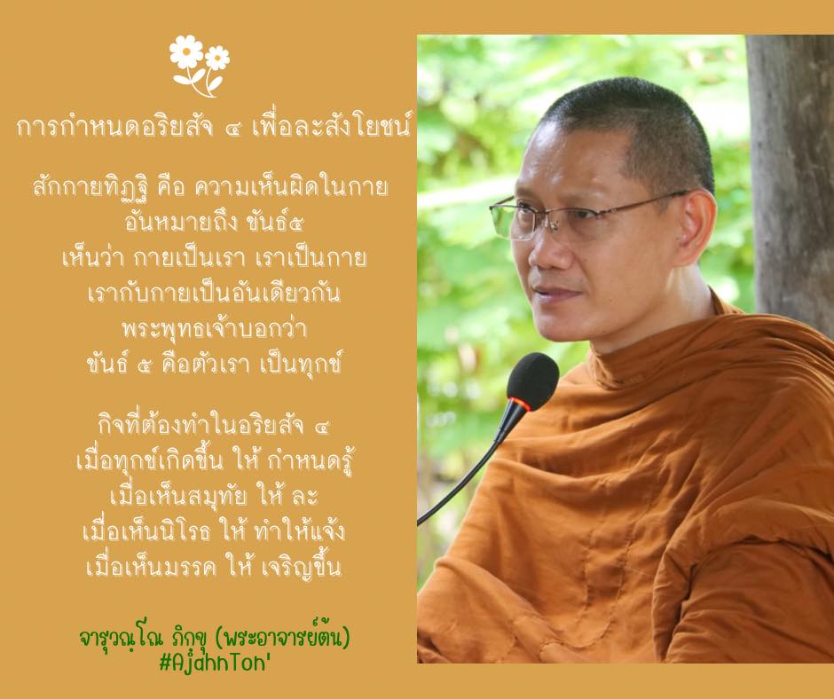 การเข้าสู่อริยภูมิ (๑. โสดาบัน) พระพุทธเจ้าทรงแสดงการละกิเลสไว้ในสังโยชน์ ๑๐ ประการที่จะทำให้บรรลุถึง “นิโรธ” (ความดับทุกข์) สำหรับชั้น โสดาบัน การกำหนดรู้อริยสัจให้กำหนดรู้ในสังโยชน์ ๓ ข้อแรกจากสังโยชน์ ๑๐ อย่าง ได้แก ๑. สักกายทิฏฐิ (สัก-กา-ยะ-ทิด-ถิ) คือ ความเห็นผิดในกาย ยึดมั่นสังขารร่างกายว่า เป็นตัวตน หรือมีความเห็นผิดใน ธาตุ ๔ ขันธ์ ๕ ว่า เป็นตน เป็นของตน ๒. วิจิกิจฉา คือ ความสงสัยในคุณแห่งพระรัตนตรัย สงสัยเรื่องมรรคผล สงสัยพระนิพพาน สงสัยในทางให้ถึงพระนิพพาน ๓. สีลัพพตปรามาส (สี-ลับ-พะ-ตะ-ปะ-รา-มาด) คือ การลูบคลำศีลและวัตร ได้แก่ การรักษาศีล บำเพ็ญวัตร เพื่อจุดมุ่งหมายอื่น เช่น มุ่งสรรเสริญ มุ่งลาภสักการะ เป็นต้น มิใช่เพื่อความบริสุทธิ์ สักกายทิฏฐิคืออะไร สักกายทิฏฐิ คือ…