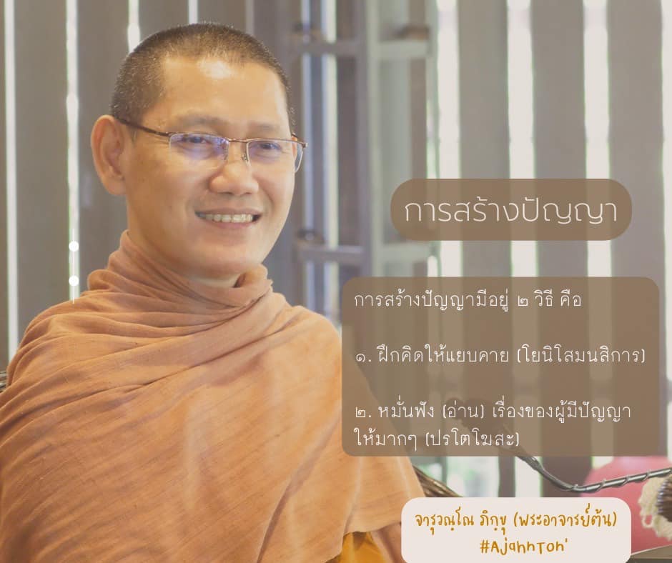 การสร้างปัญญาในทางธรรมทำได้ ๒ วิธี๑. ฝึกคิดให้แยบคาย (โยนิโสมนสิการ)๒. หมั่นฟัง (อ่าน) เรื่องของผู้มีปัญญาให้มาก ๆ (ปรโตโฆสะ) จารุวณฺโณ ภิกฺขุ (พระอาจารย์ต้น)#AjahnTon‘